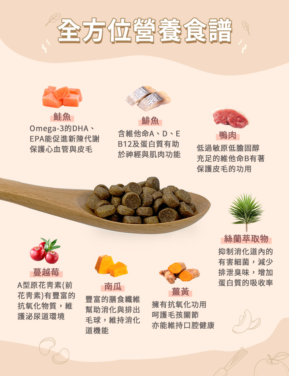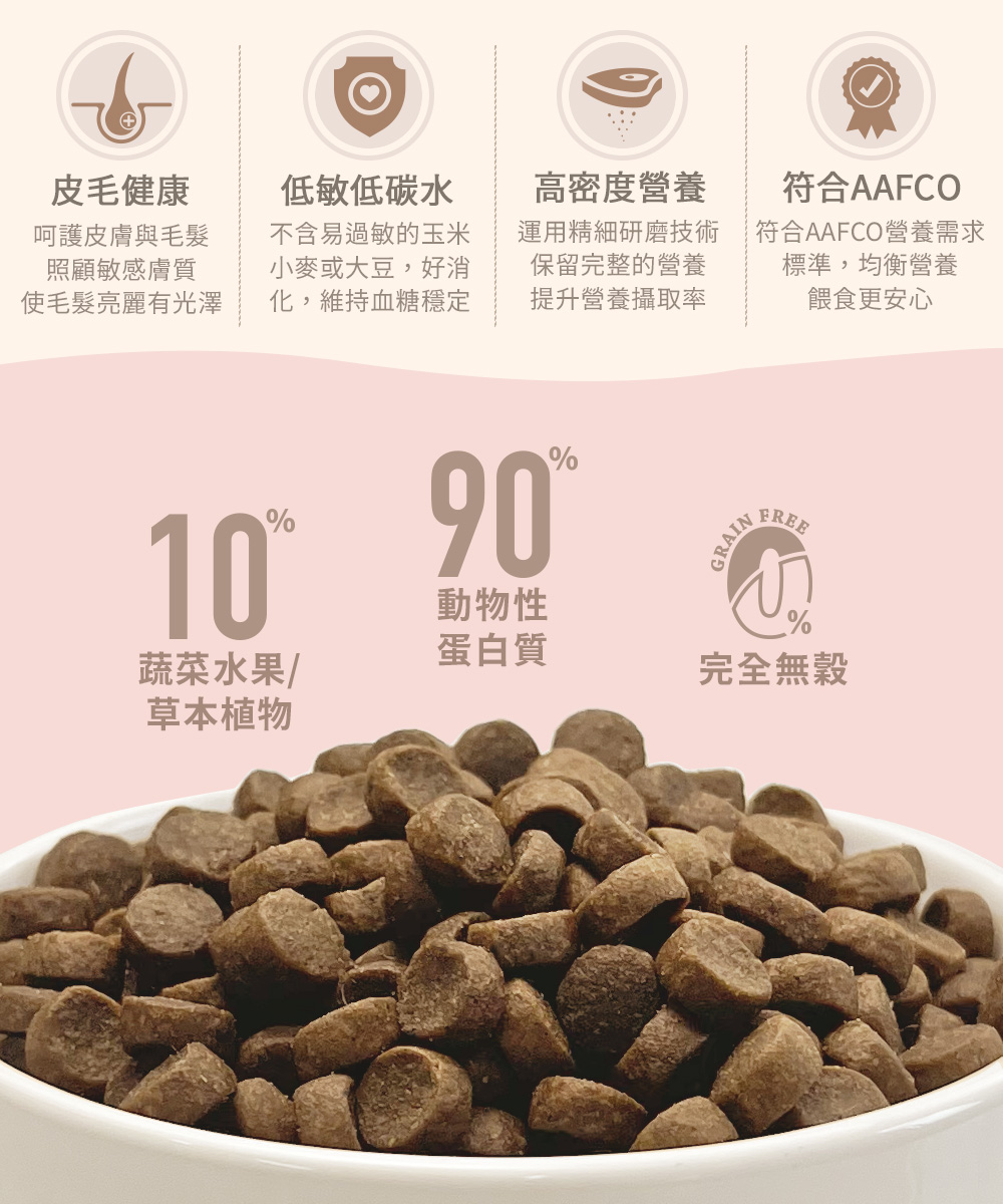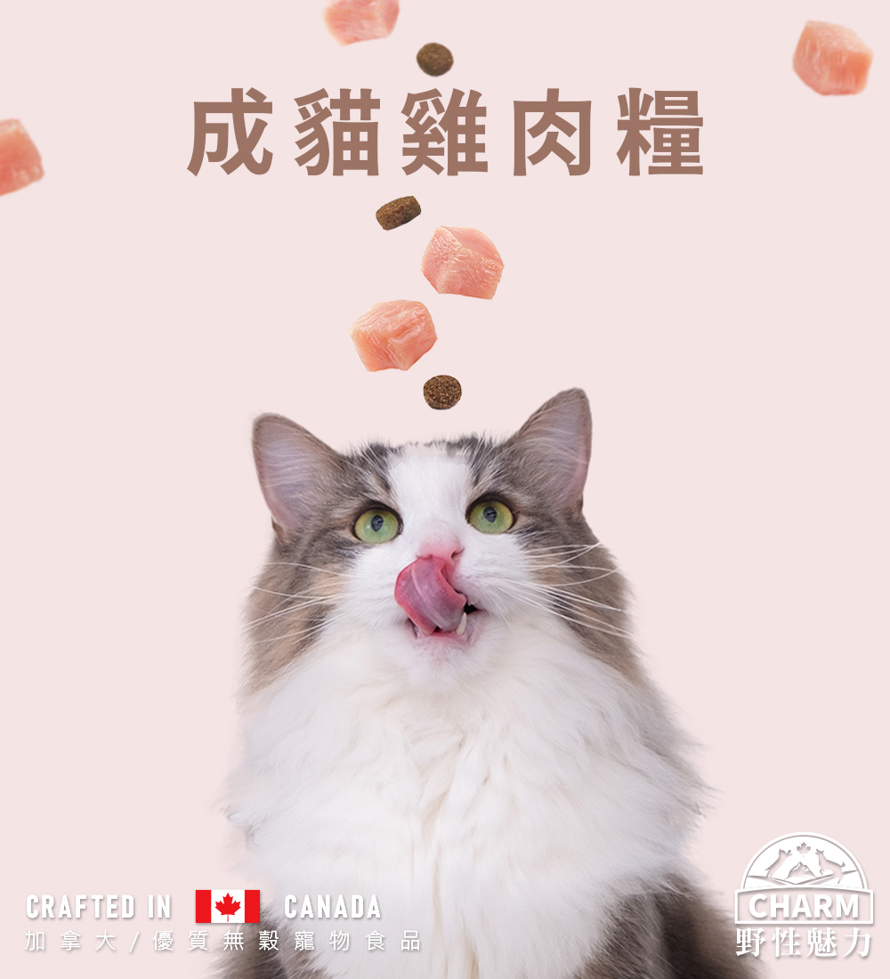 新鮮精細研磨雞肉粉、火雞肉粉丶白鮭魚粉、大西洋鮭魚粉、鷹嘴豆、綠豌豆、紅扁豆、雞蛋粉、雞脂肪、亞麻籽、啤酒乾酵母、雞肝、鯡魚粉、鴨肉粉、鯡魚油、丙酸鈣、海帶粉、卵磷脂、DL-蛋氨酸、牛磺酸、絲蘭萃取物、氣化膽鹼、檸檬酸、薆越莓、藍莓、乾番茄渣、南瓜、蘋果、菠菜、薄荷、洋甘菊、薑黄、芹菜籽、乾迷迭香、硫酸鋅、硫酸亞鐵、維生素E補充劑、菸酸補充劑、硫酸銅、L-賴氨酸鹽酸鹽、硒蛋白、亞硒酸鈉、硝酸硫胺明、硫酸錳、鹽酸鹽葡萄糖胺、硫酸軟骨素、碘酸鈣、泛酸鈣、維生素A補充劑、維生素B12補充劑、維生素K補充劑、核黄素、鹽酸吡哆醇、生物素、碳酸鈷、葉酸、維生素D3補充劑