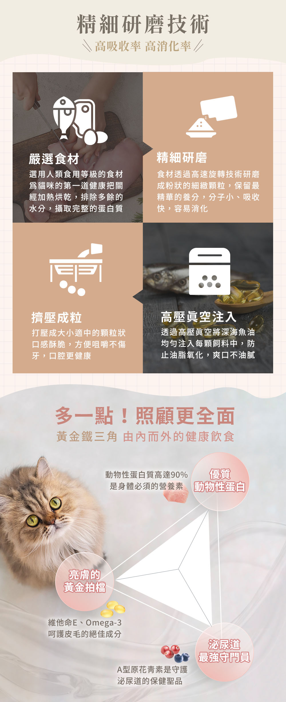粗蛋白38%、粗脂肪18%、粗纖維4.5%、粗灰分9%、牛磺酸0.3%、水分10%、鎂0.1%、鈣2.1%、磷1.3%