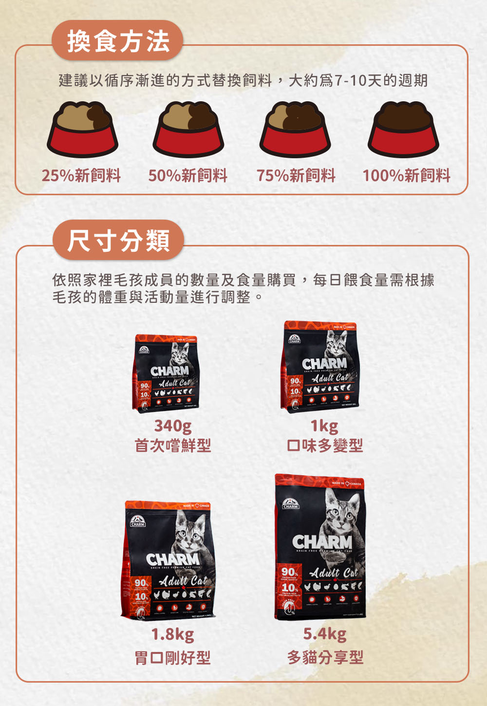 3.為避免寵物腸胃不適,請以7天的時間作為適應期,將新舊飼料逐漸遞增減的方式換糧