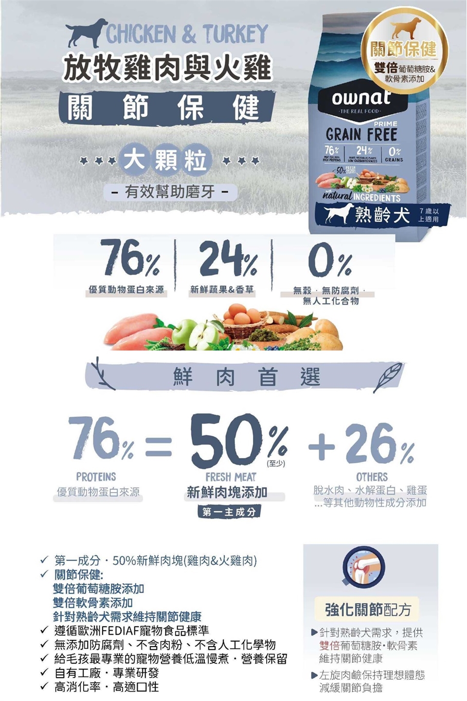 【Ownat歐娜特】無穀天然鮮肉熟齡犬糧-關節保健(放牧雞肉+火雞)