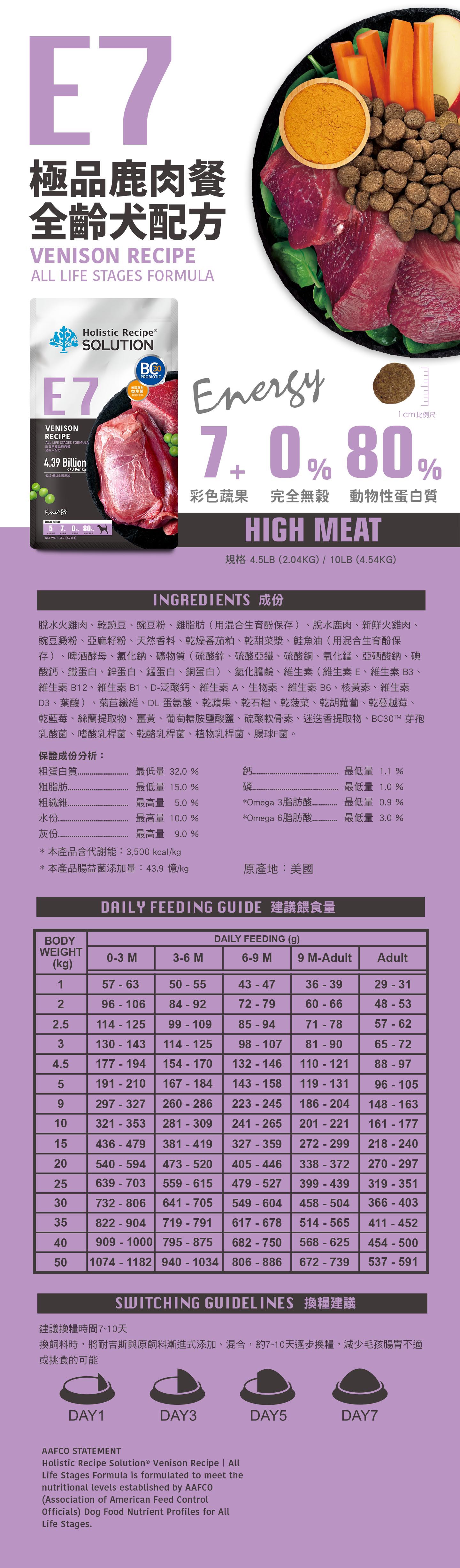 脫水火雞肉、乾豌豆、豌豆粉、雞脂肪(用混合生育酚保存)、脫水鹿肉、新鮮火雞肉、豌豆澱粉、亞麻籽粉、天然香料、乾燥番茄粕、乾甜菜漿、鮭魚油(用混合生育酚保存)、啤酒酵母、氯化鈉、礦物質(硫酸鋅、硫酸亞鐵、硫酸銅、氧化錳、亞硒酸鈉、碘酸鈣、鐵蛋白、鋅蛋白、錳蛋白、銅蛋白)、氯化膽鹼、維生素(維生素 E、維生素 B3、維生素 B12、維生素 B1、D-泛酸鈣、維生素 A、生物素、維生素 B6、核黃素、維生素 D3、葉酸)、菊苣纖維、DL-蛋氨酸、乾蘋果、乾石榴、乾菠菜、乾胡蘿蔔、乾蔓越莓、乾藍莓、絲蘭提取物、薑黃、葡萄糖胺鹽酸鹽、硫酸軟骨素、迷迭香提取物、BC30TM 芽孢乳酸菌、嗜酸乳桿菌、乾酪乳桿菌、植物乳桿菌、腸球F菌。