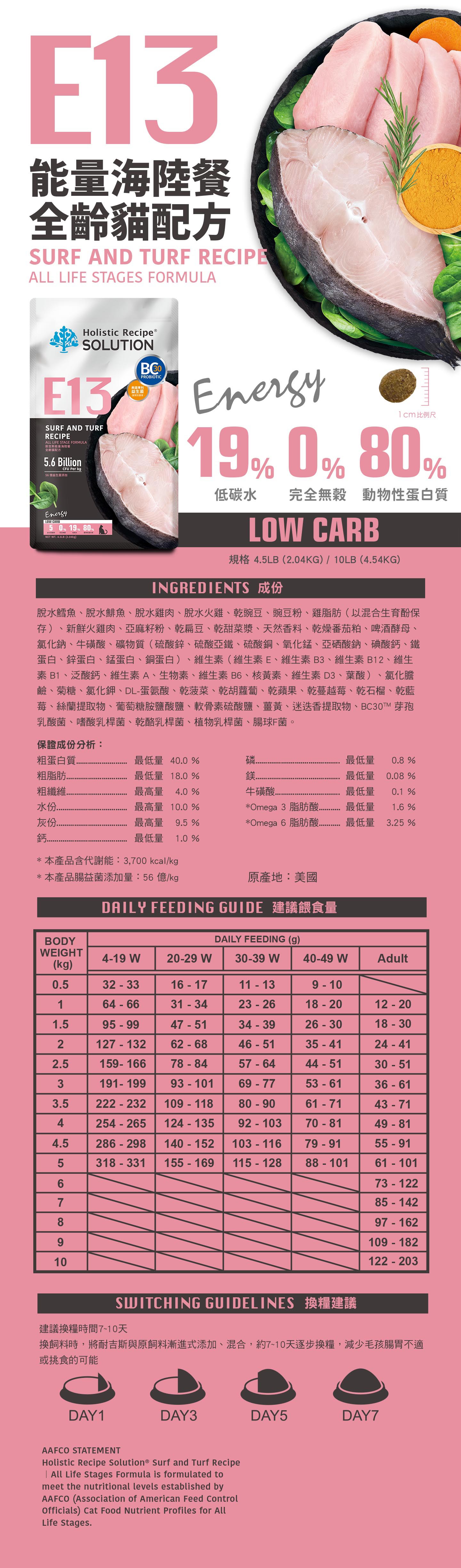粗蛋白質最低量 40.0%、粗脂肪最低量 률 18.0 %、粗纖維最高量 4.0 %、水份最高量 10.0%、灰份最高量 9.5%、鈣最低量 1.0%、磷最低量0.8 %、鎂最低量 0.08 %、牛磺酸最低量 0.1 %、Omega3脂肪酸1.6 %、Omega 6脂肪酸最低量3.25%、本產品含代謝能3,700kcal/k
