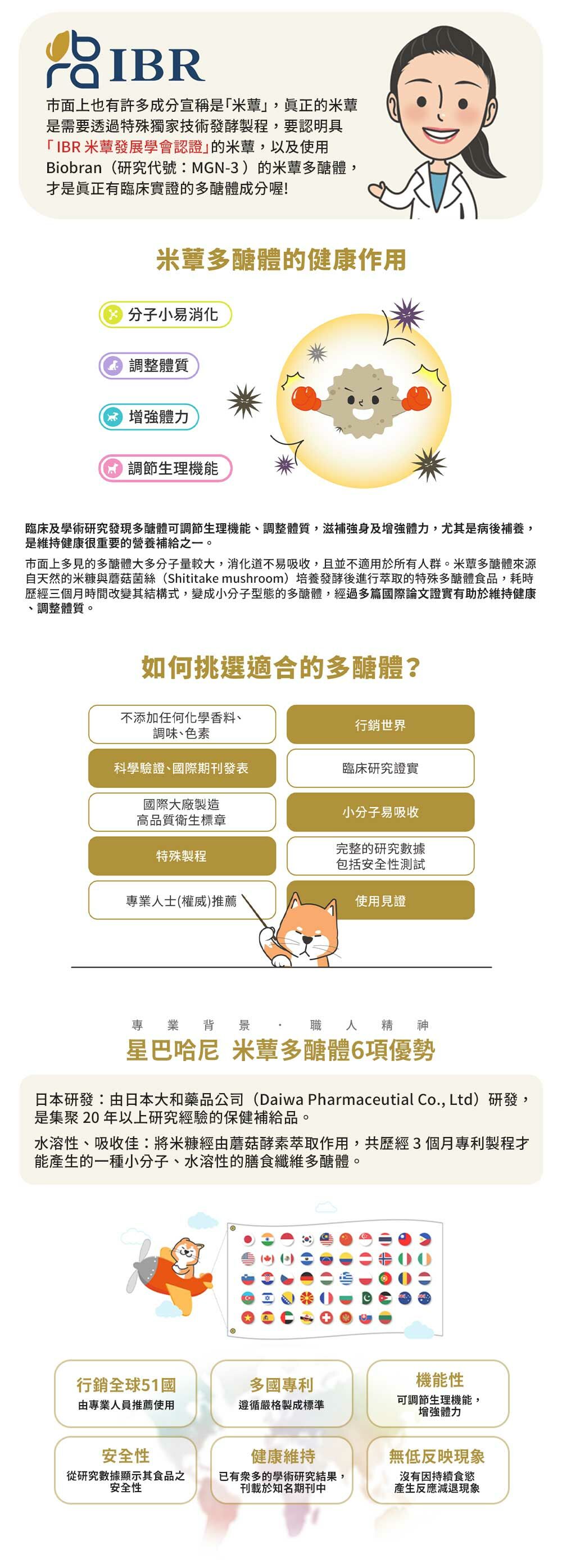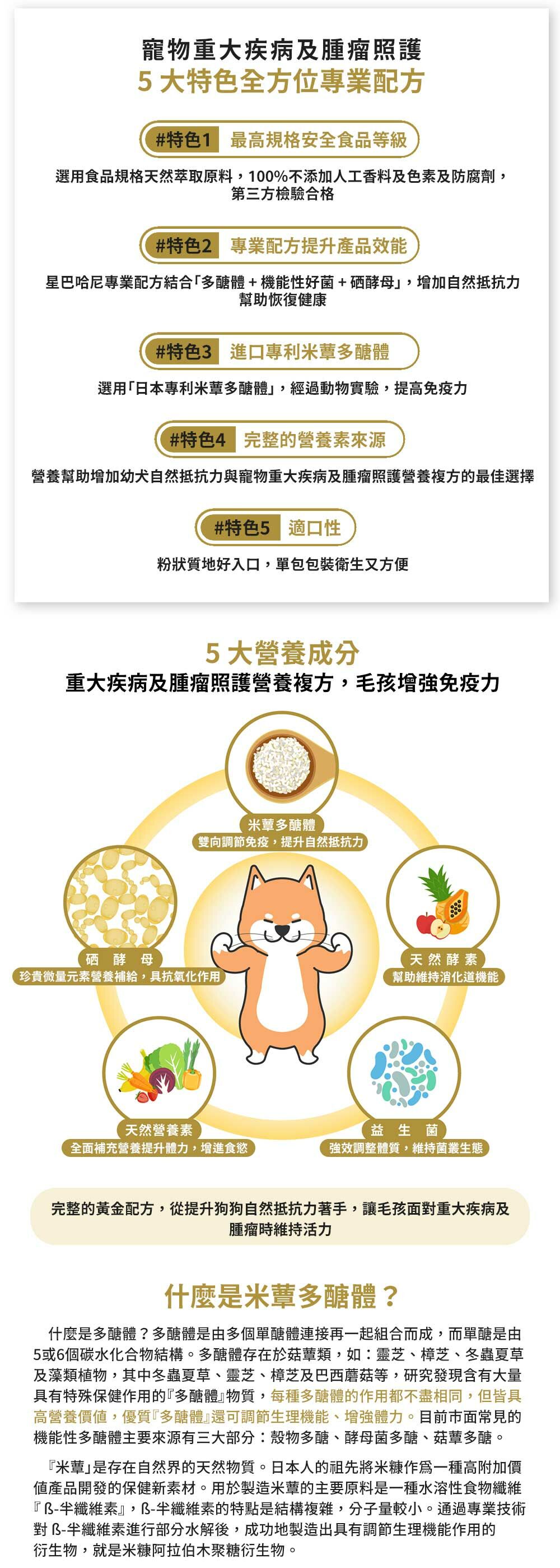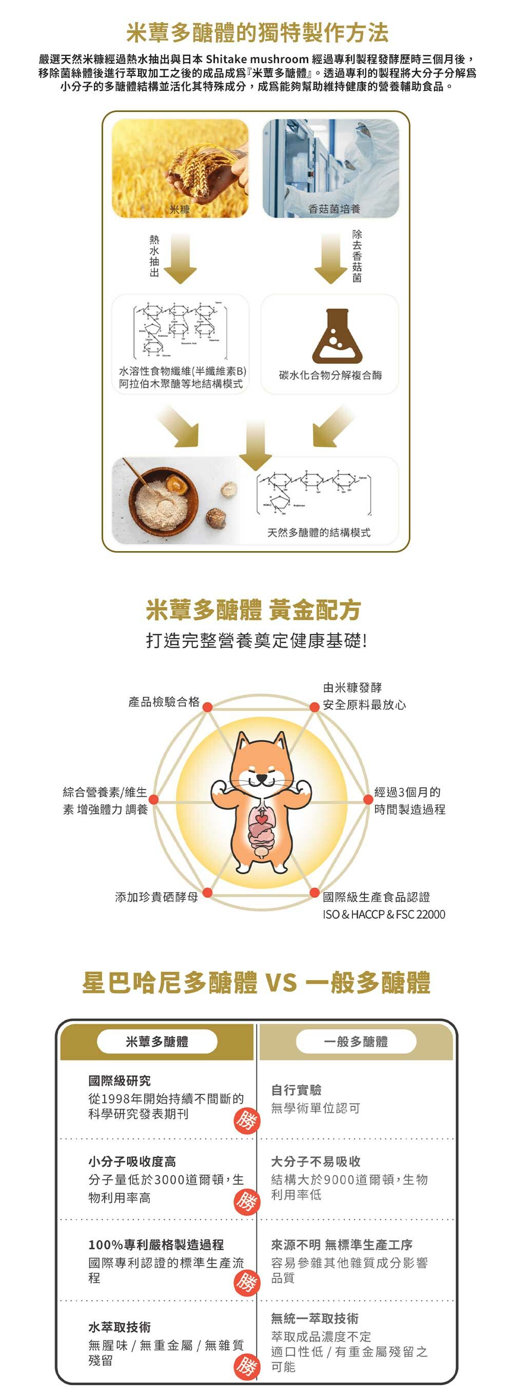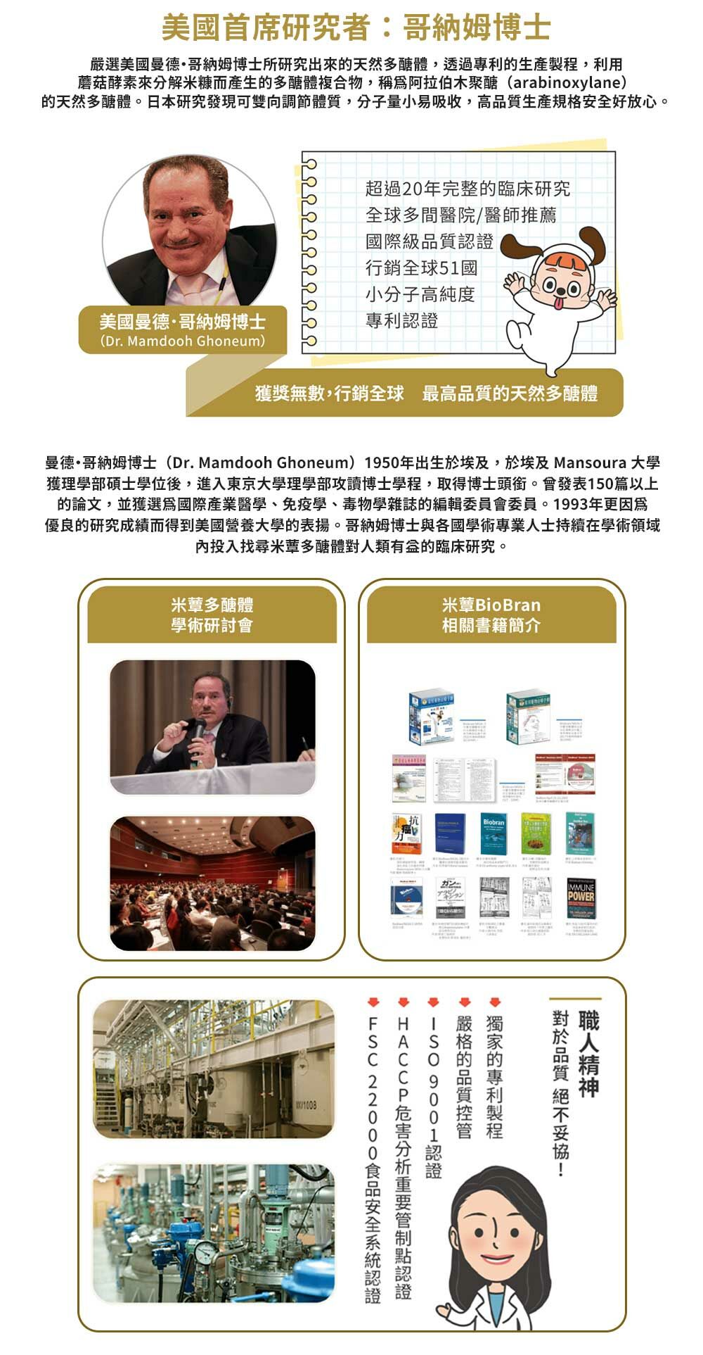 米糠萃取物(Biobran米蕈多醣體)、微晶纖維素、蛋白質分解酵素4.5、蛋白質分解酵素6.0、胜肽分解酵素、鳳梨蛋白酵素、木瓜酵素、麥芽糊精、麥芽糖醇(甜味劑)、啤酒酵母粉、菊糖、鼠李糖乳酸桿菌L.rhamnosus、副乾酪乳酸桿菌L.paracasei、植物乳酸菌L.plantarum、嗜熱鏈球菌S.thermophilus、龍根菌B.longum、磷酸鈣、維生素C、硒酵母、維生素E、菸鹼素、本多酸鈣、維生素B1、維生素B6、維生素B2、維生素A、葉酸、維生素D、維生素B12
