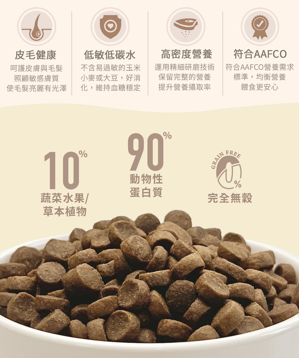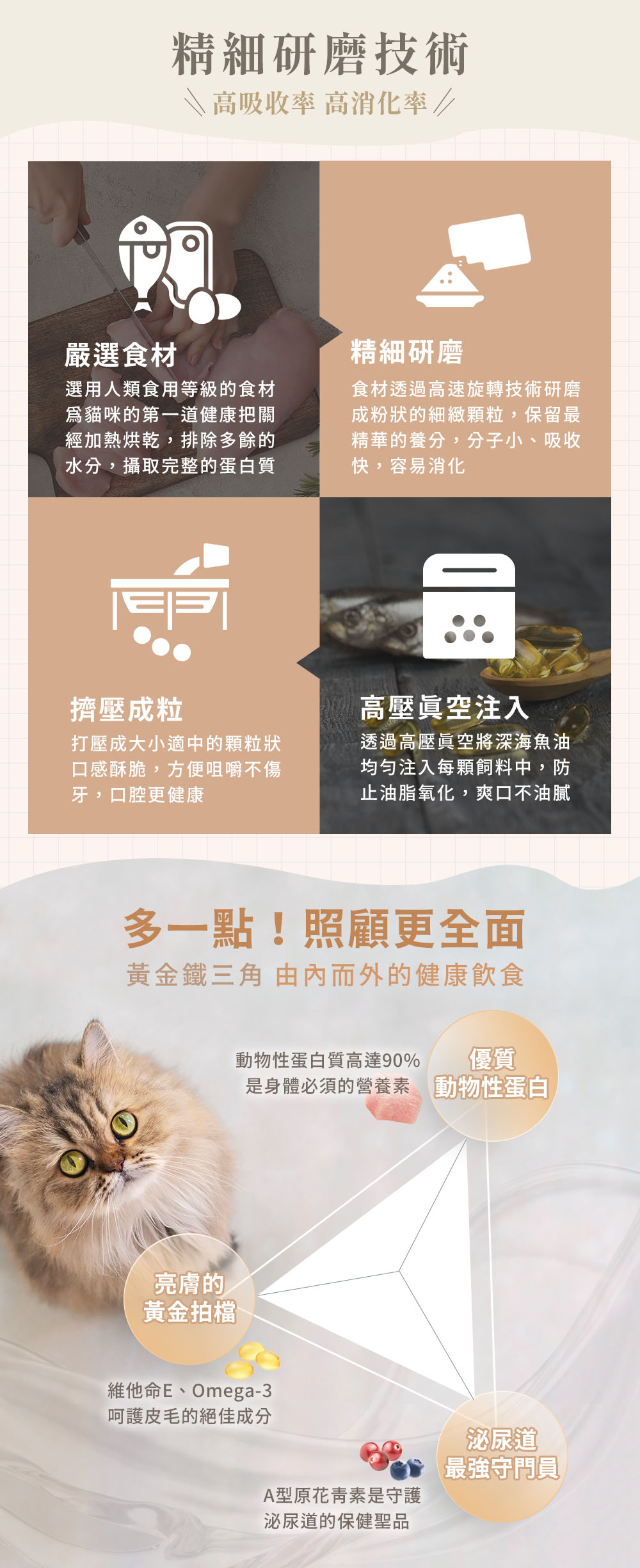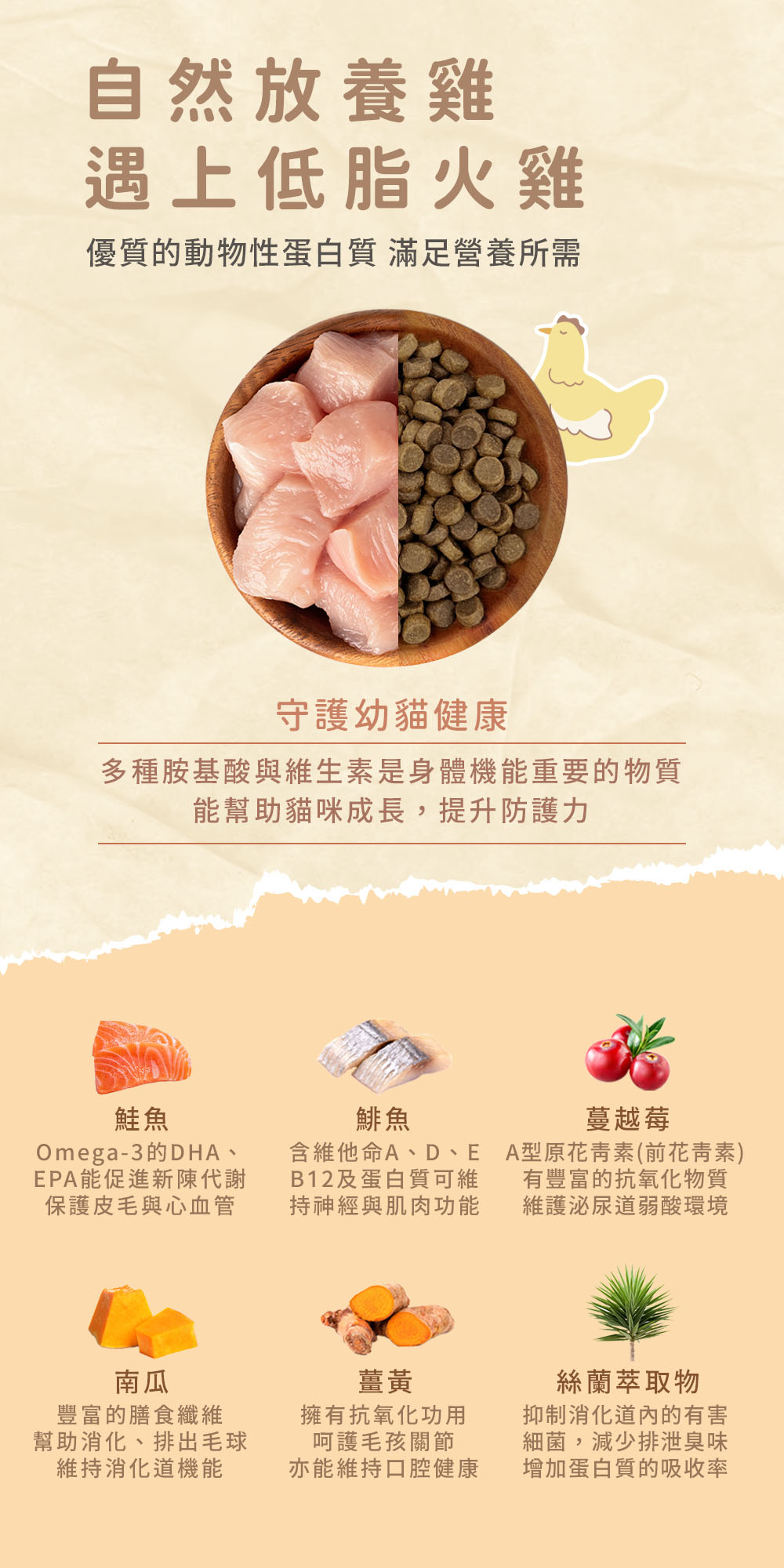 粗蛋白38%、粗脂肪17%、粗纖維5%、粗灰分8%、牛磺酸0.3%、水分10%、鎂0.1%、鈣2.2%、磷1.3%