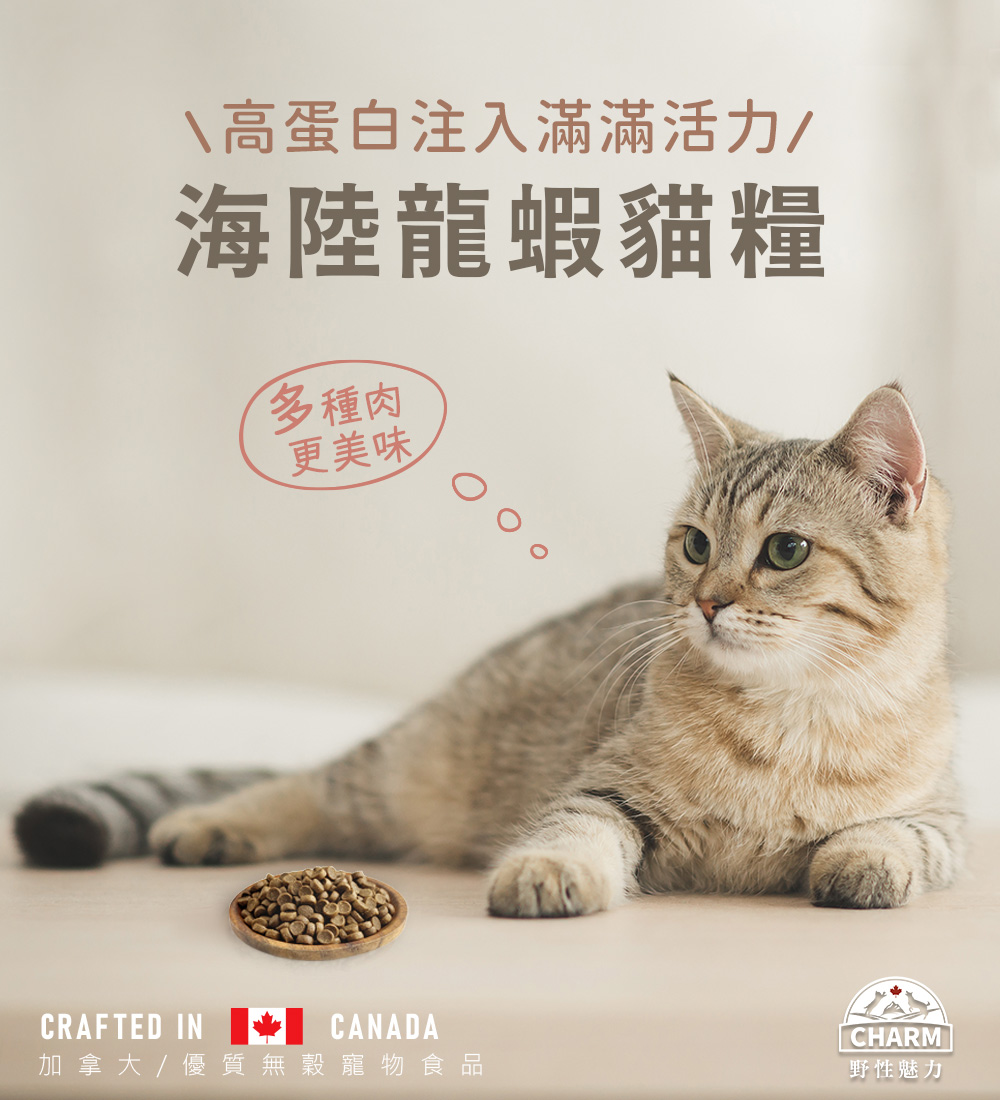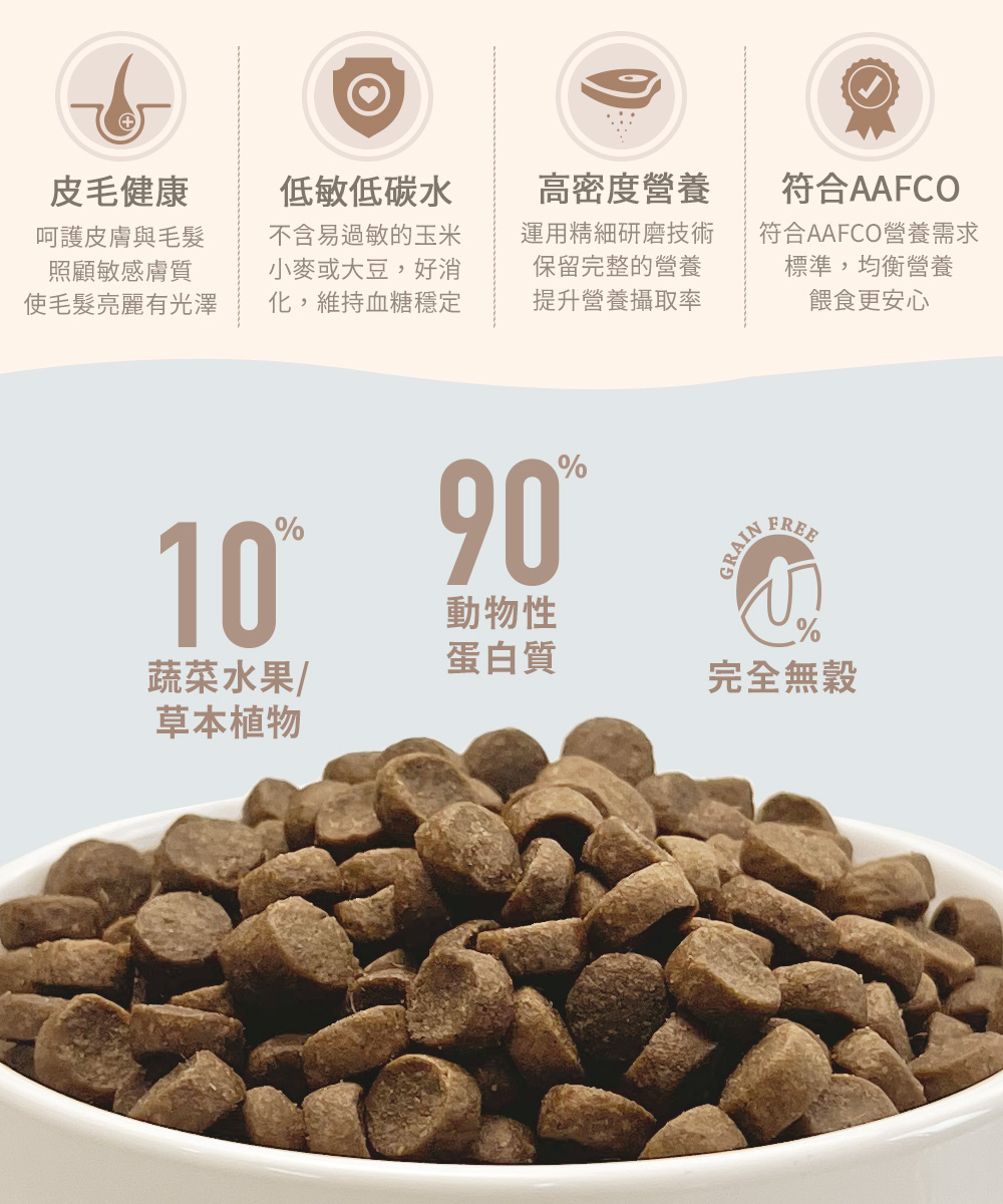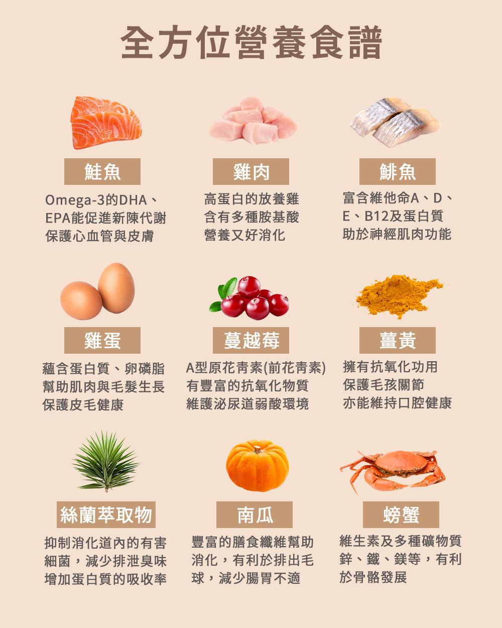 新鮮精細研磨雞肉粉、鮭魚粉、鷹嘴豆、雞脂肪、白鮭魚粉、綠豌豆、紅扁豆、雞蛋粉、啤酒乾酵母、雞肝、大西洋鯡魚粉、鯡魚油、葵花油、大西洋龍蝦粉、螃蟹粉、亞麻籽、丙酸鈣、海帶粉、卵磷脂、DL-蛋氨酸、牛磺酸、絲蘭萃取物、氣化膽鹼、檸檬酸、藑越莓、藍莓、乾番茄渣、南瓜、蘋果、菠菜、薄荷、洋甘菊、薑黄、芹菜籽、乾迷迭香、硫酸鋅、硫酸亞鐵、維生素E補充劑、菸酸補充劑、硫酸銅、L-賴氨酸鹽酸鹽、硒蛋白、亞硒酸鈉、硝酸硫胺明、硫酸錳、鹽酸鹽葡萄糖胺、硫酸軟骨素、碘酸鈣、泛酸鈣、維生素A補充劑、維生素B12補充劑、維生素K補充劑、核黃素、鹽酸吡哆醇、生物素、碳酸鈷、葉酸、維生素D3補充劑