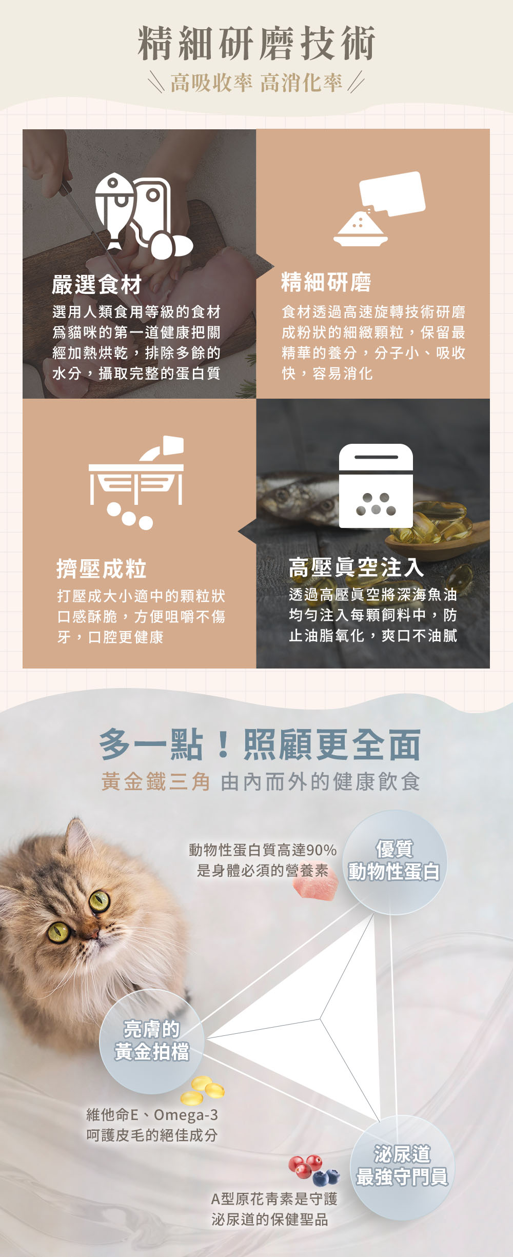 粗蛋白38%、粗脂肪18%、粗纖維4.5%、粗灰分9%、牛磺酸0.3%、水分10%、鎂0.1%、鈣2%、磷1.2%