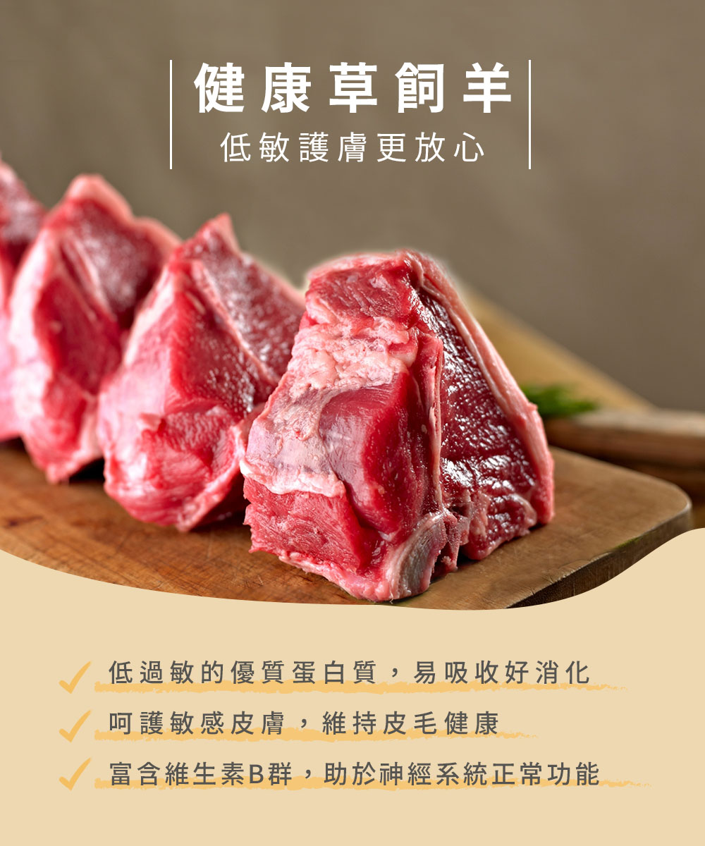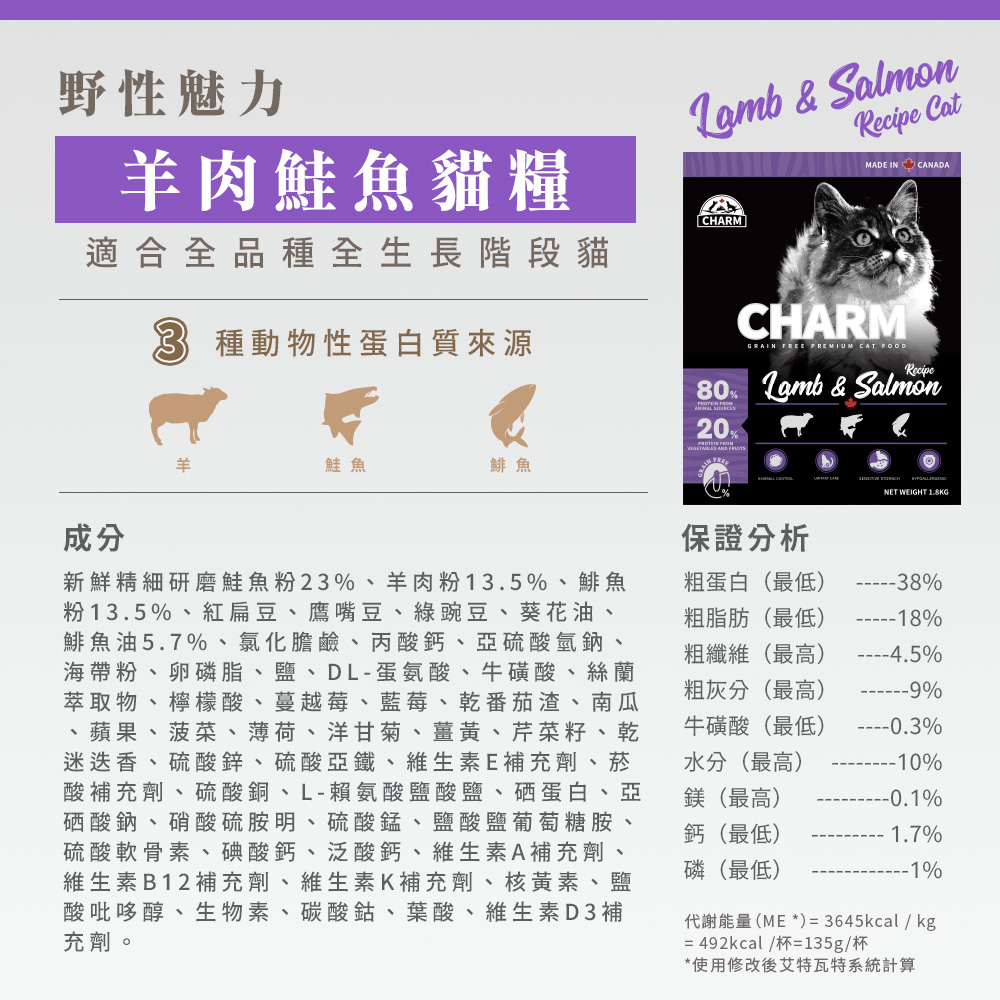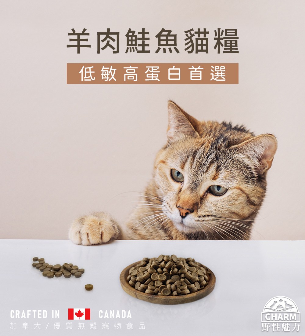 新鮮精細研磨鮭魚粉23%、羊肉粉13.5%、鲱魚13.5%、紅扁豆、鷹嘴豆、綠豌豆、葵花油、鲱魚油5.7%、氯化膽鹼、丙酸鈣、亞硫酸氫鈉、海帶粉、卵磷脂、鹽、DL-蛋胺酸、牛磺酸、斯蘭萃取物、檸檬酸、蔓越莓、藍莓、乾番茄渣、南瓜、蘋果、菠菜、薄荷、洋甘菊、薑黃、芹菜籽、乾迷迭香、硫酸鋅、硫酸亞鐵、維生素E補充劑、菸酸補充劑、硫酸銅、L-賴氨酸鹽酸鹽、硒蛋白、亞硒酸鈉、硝酸硫胺明、硫酸錳、鹽酸鹽葡萄糖胺、硫酸軟骨素、碘酸鈣、泛酸鈣、維生素A補充劑、維生素B12補充劑、維生素K補充劑、核黃素、鹽酸吡哆醇、生物素、碳酸鈷、葉酸、維生素D3補充劑