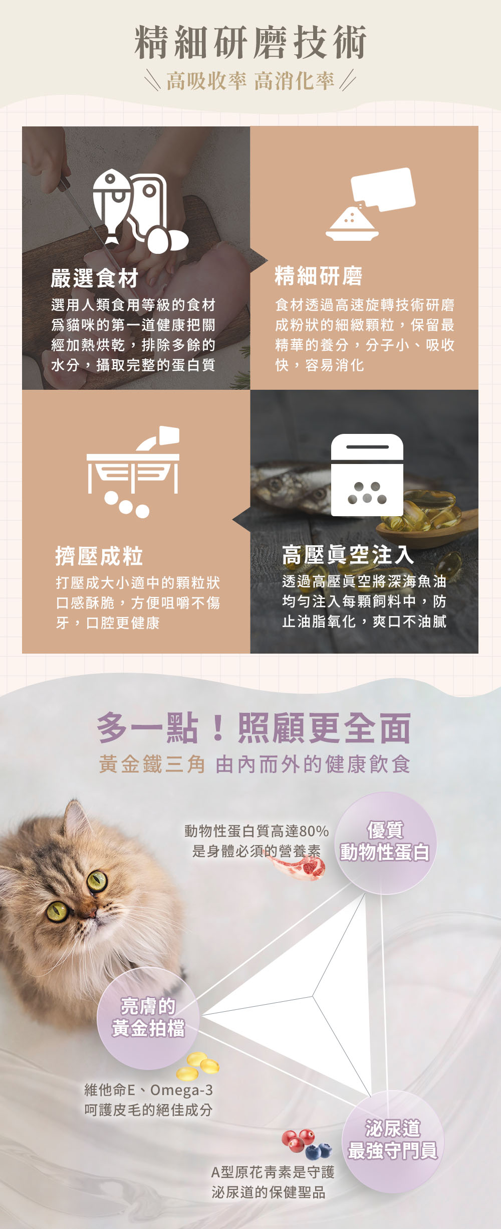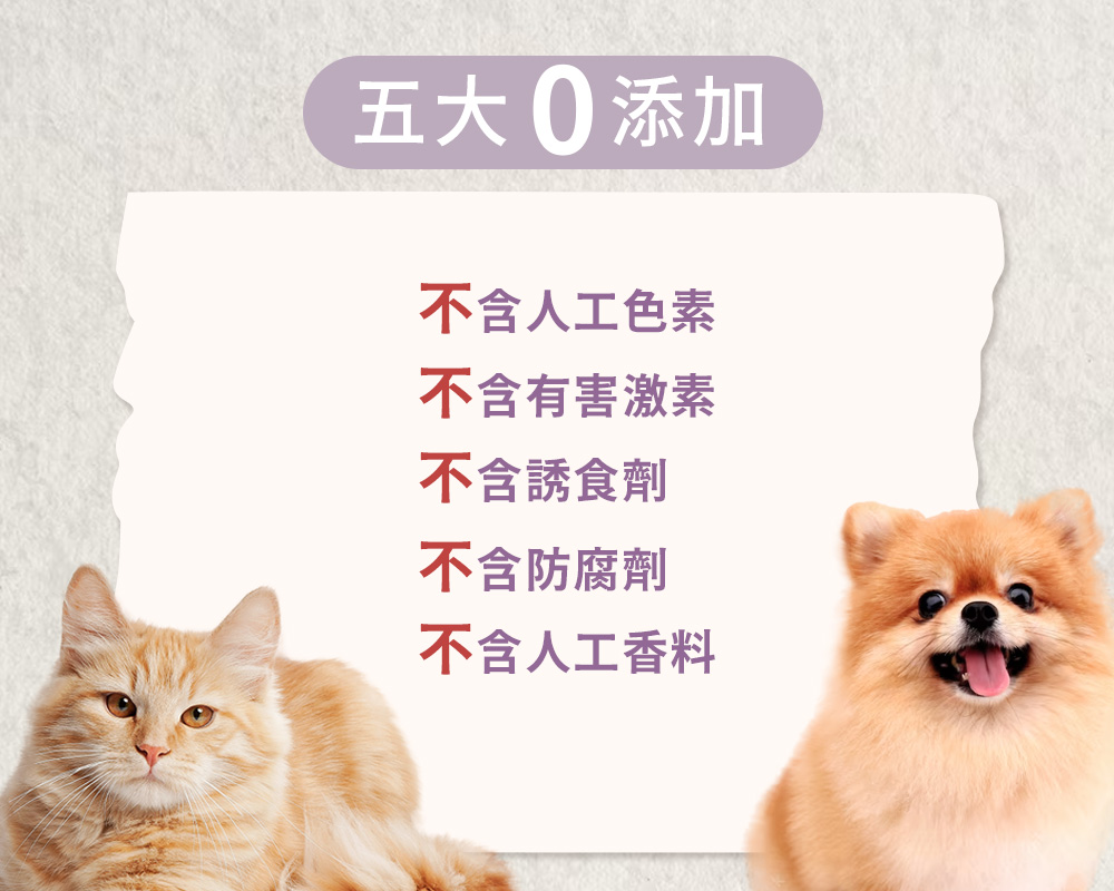 粗蛋白38%、粗脂肪18%、粗纖維4.5%、粗灰分9%、牛磺酸0.3%、水分10%、鎂0.1%、鈣1.7%、磷1%
